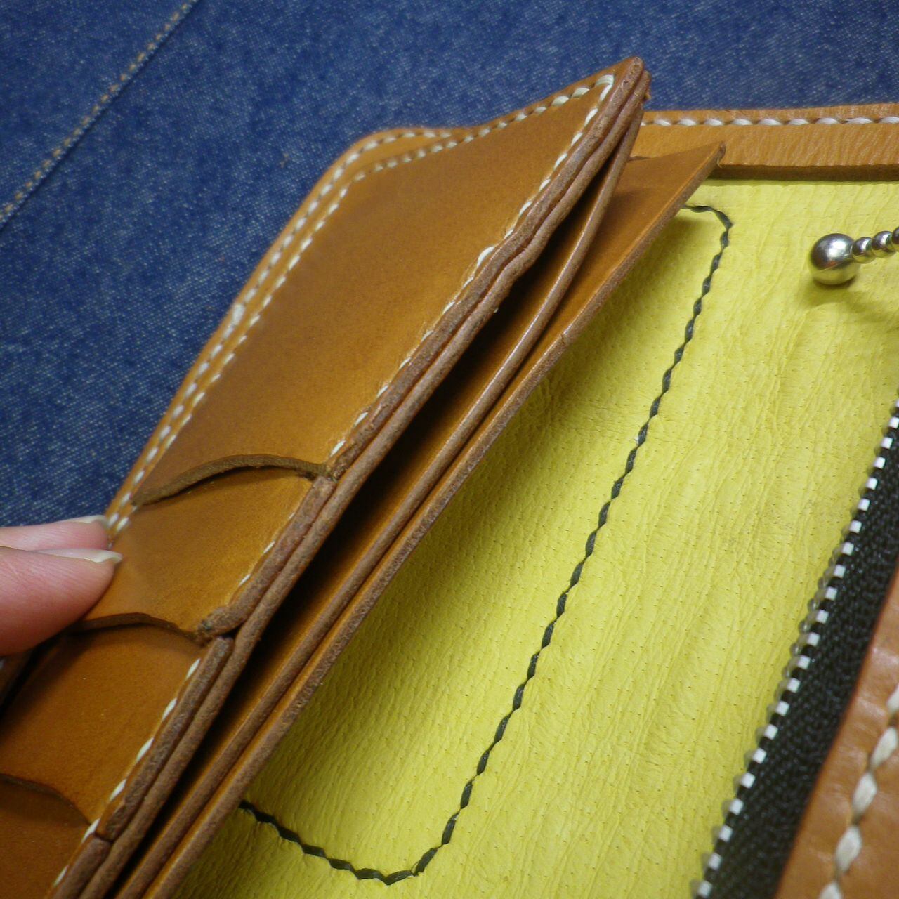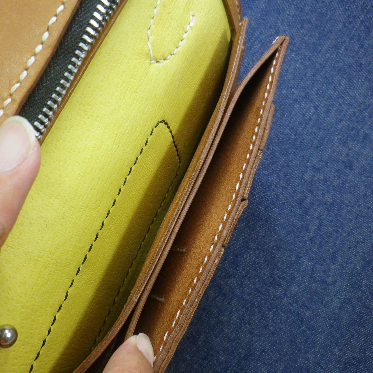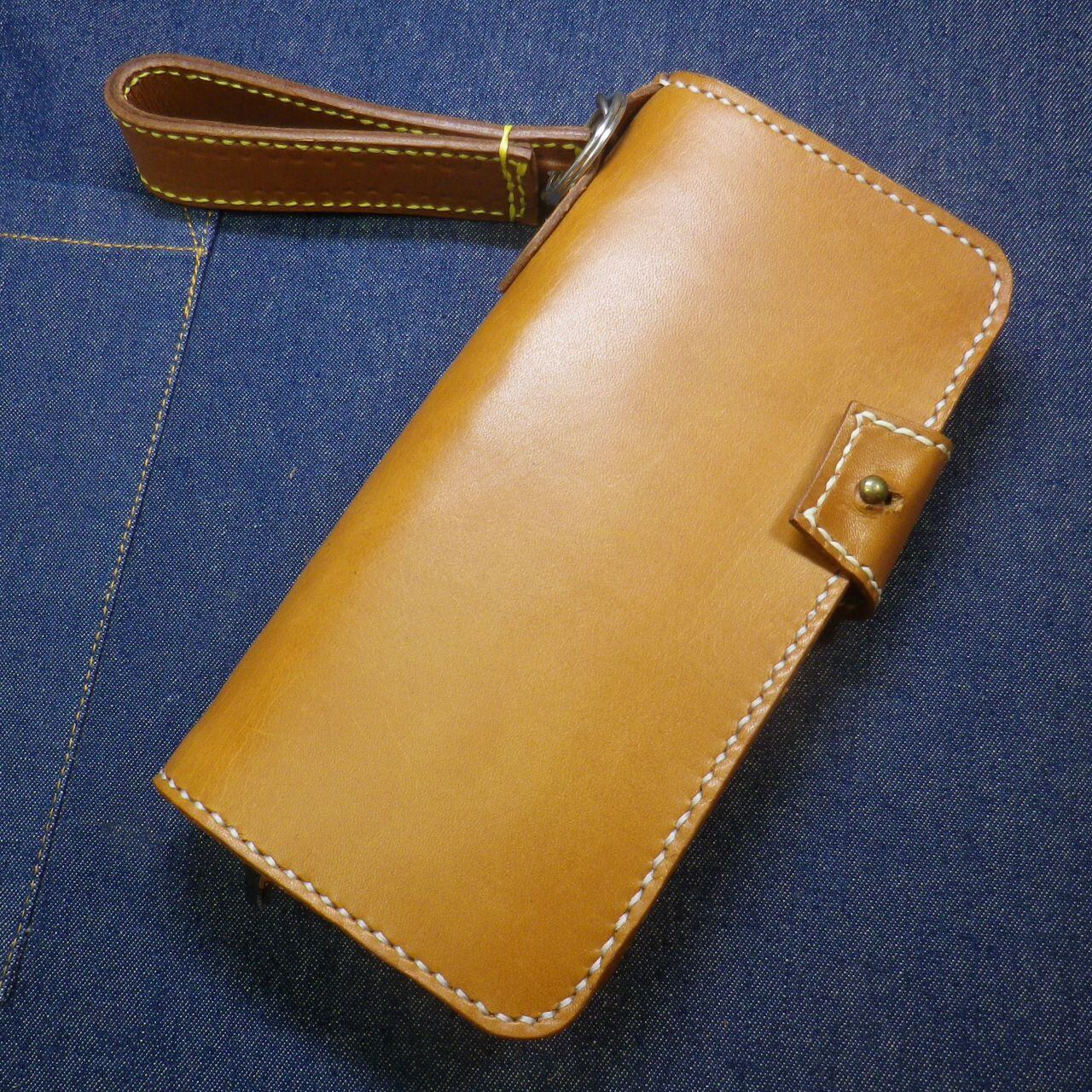 ヌメ本革を使い紙幣の入る部分にも革を縫い合わせてある逸品の長財布が出来上がりました。不用意に開いてしまうことを防止するボタンフックや、カードケースやジッパー付きのコインケースもすべてヌメ本革で作り込んであります。
