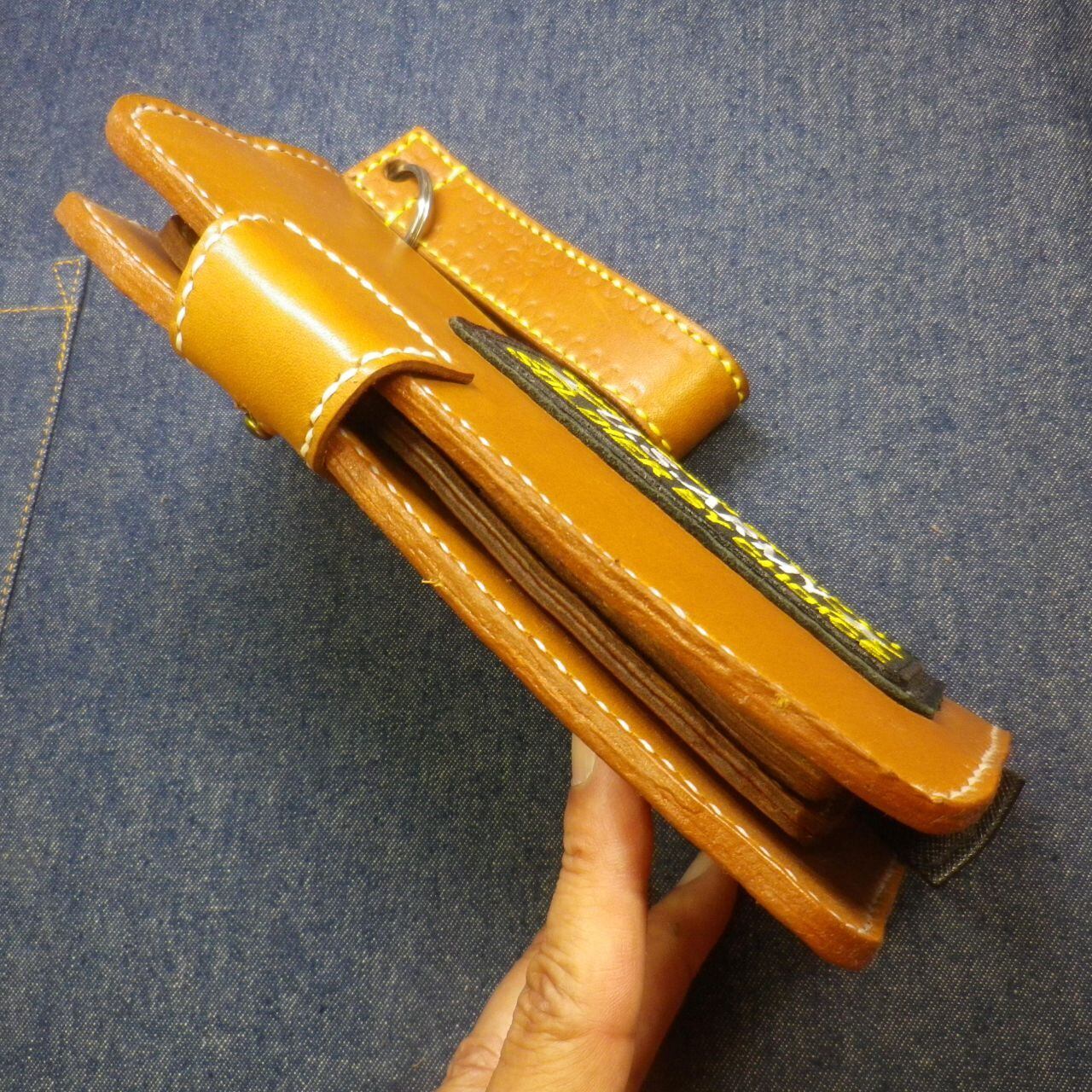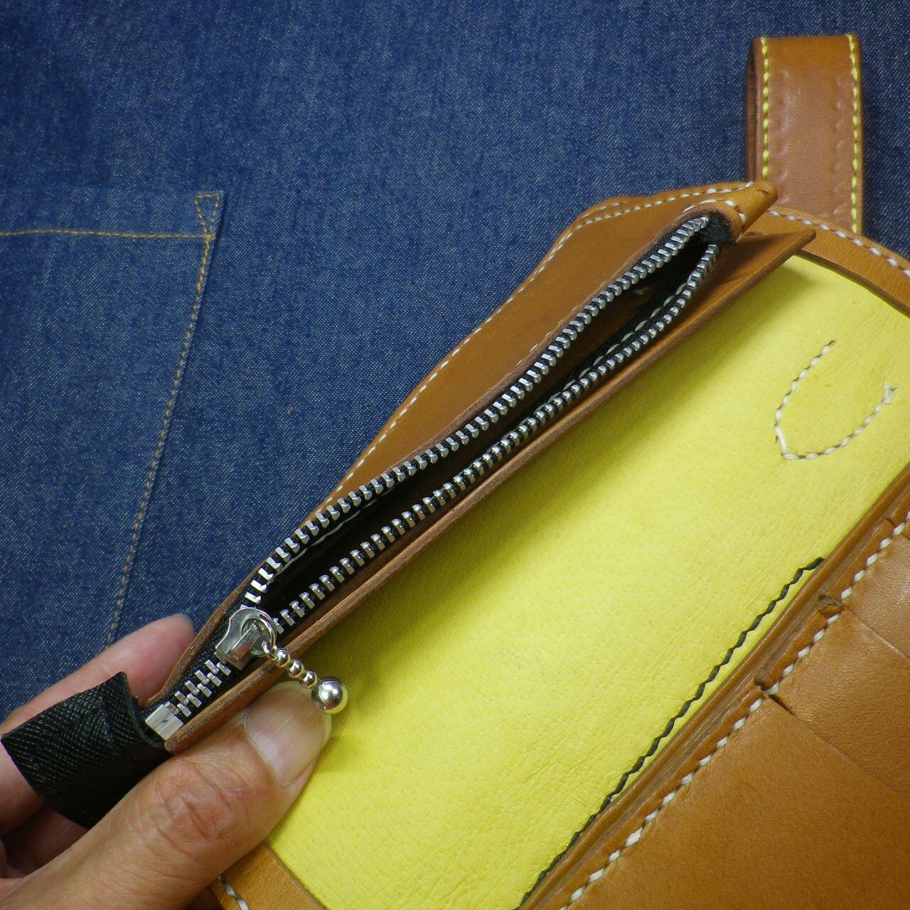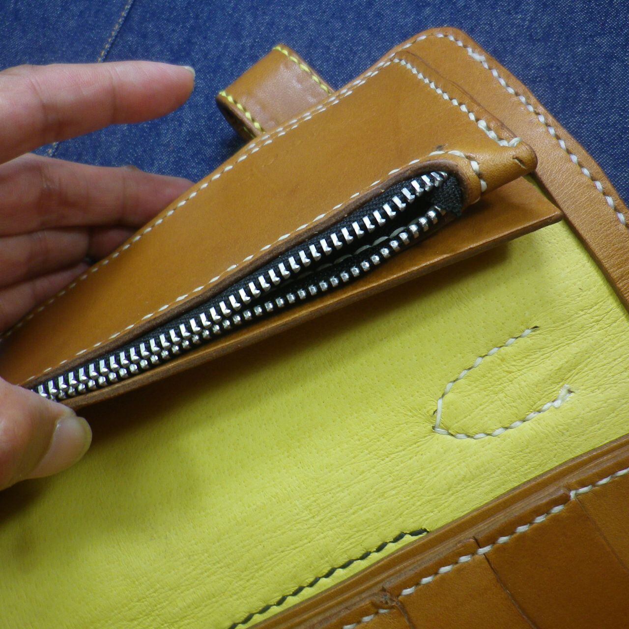 ヌメ本革を使い紙幣の入る部分にも革を縫い合わせてある逸品の長財布が出来上がりました。不用意に開いてしまうことを防止するボタンフックや、カードケースやジッパー付きのコインケースもすべてヌメ本革で作り込んであります。