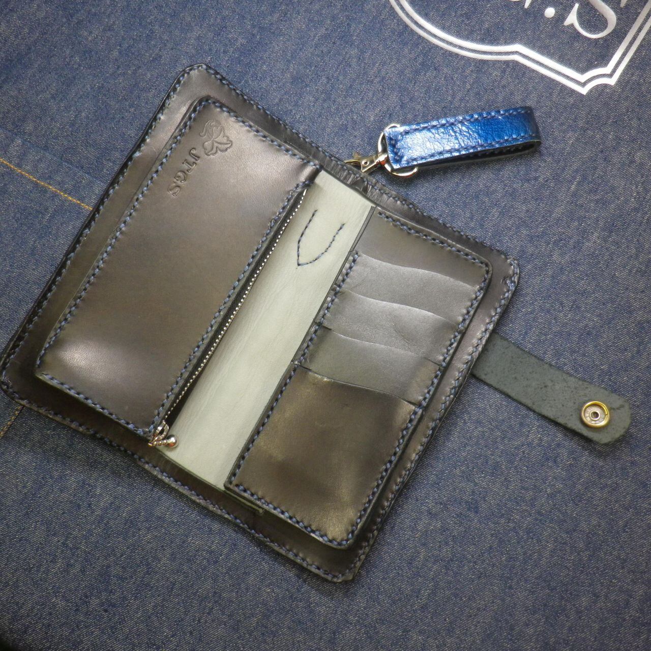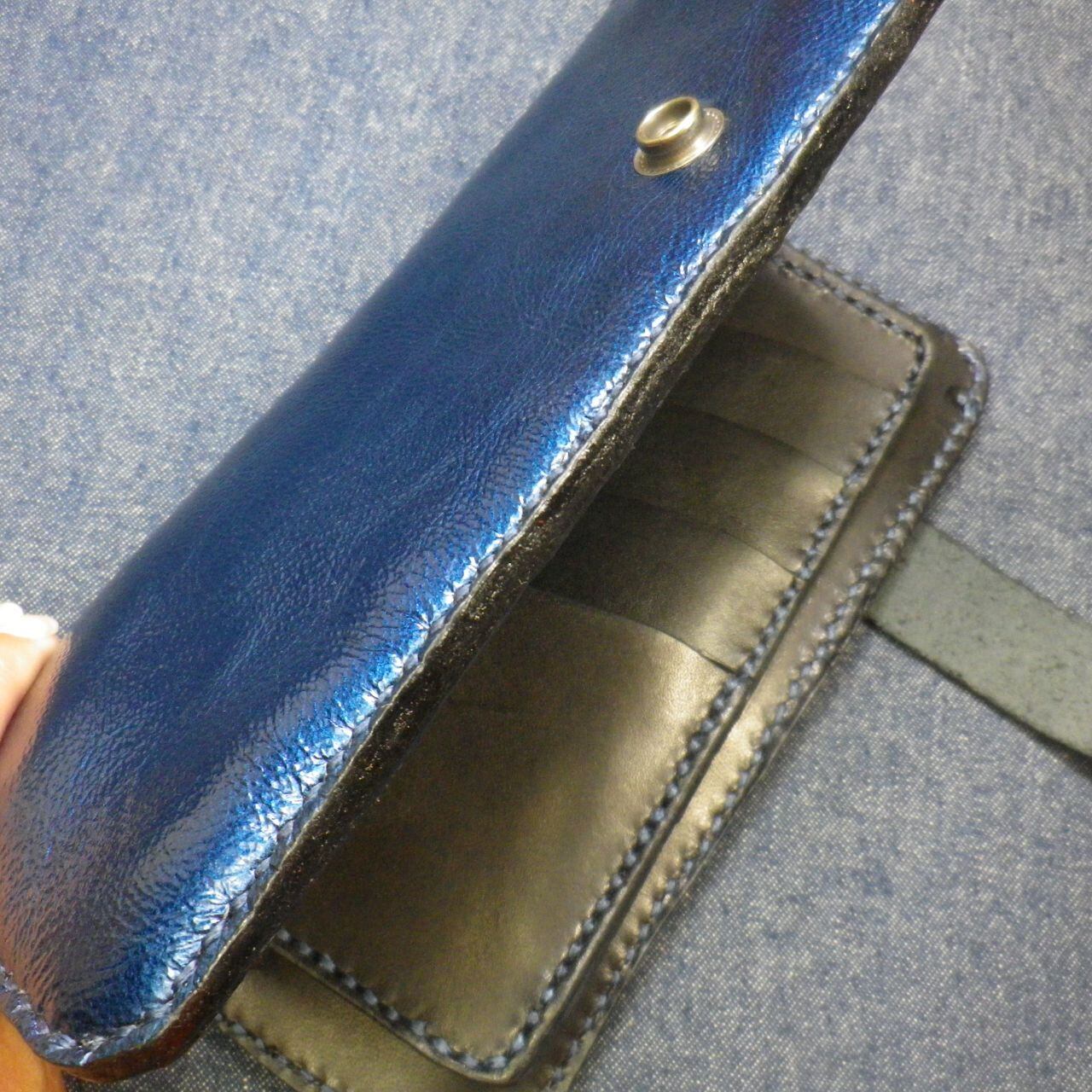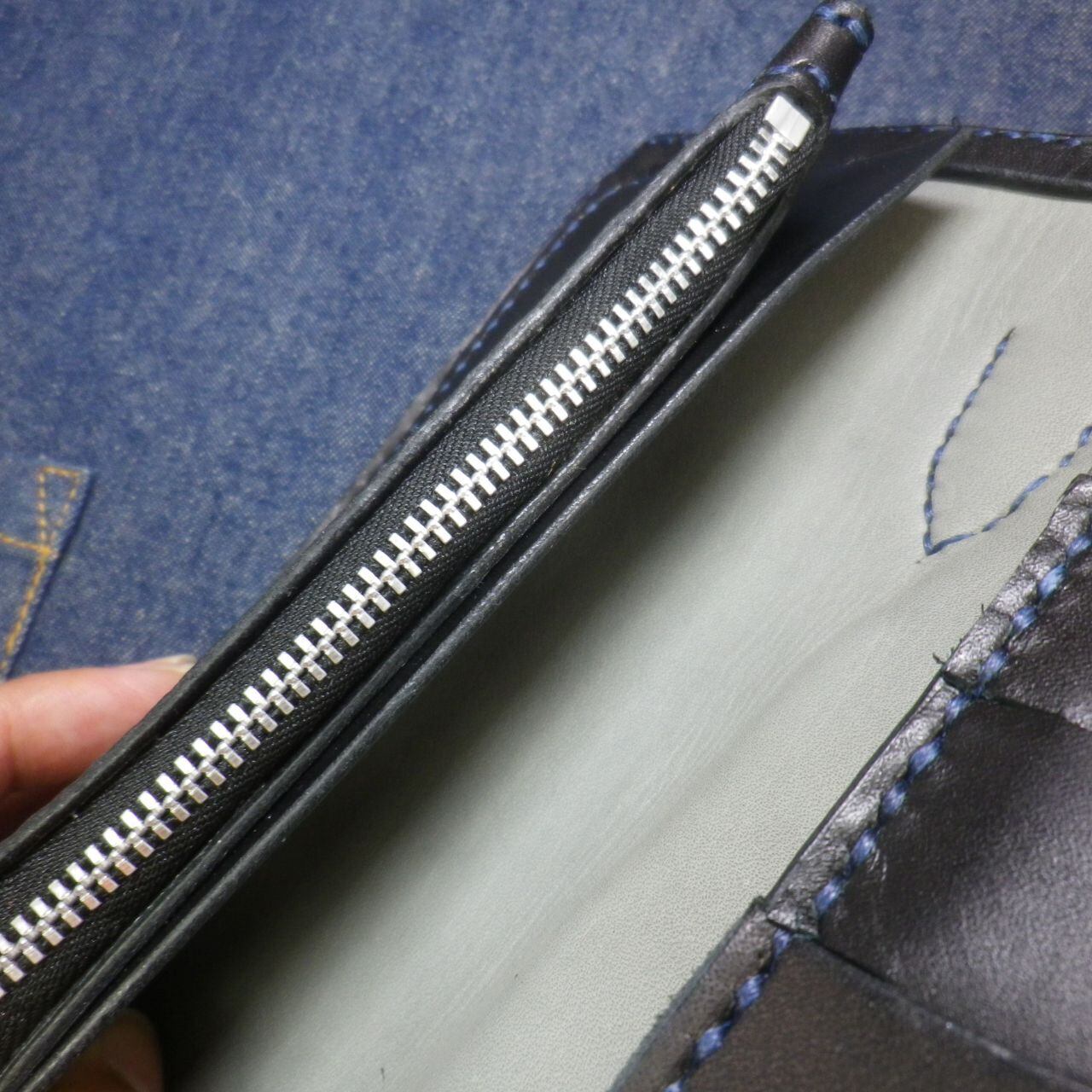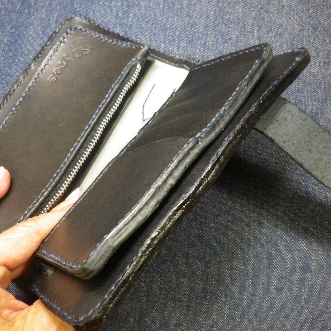 表面にエナメル本革を使い紙幣の入る部分にもシープスキン本革を縫い合わせてある逸品の長財布が出来上がりました。不用意に開いてしまうことを防止するボタンフックや、カードケースやジッパー付きのコインケースもすべて本革で作り込んであります。