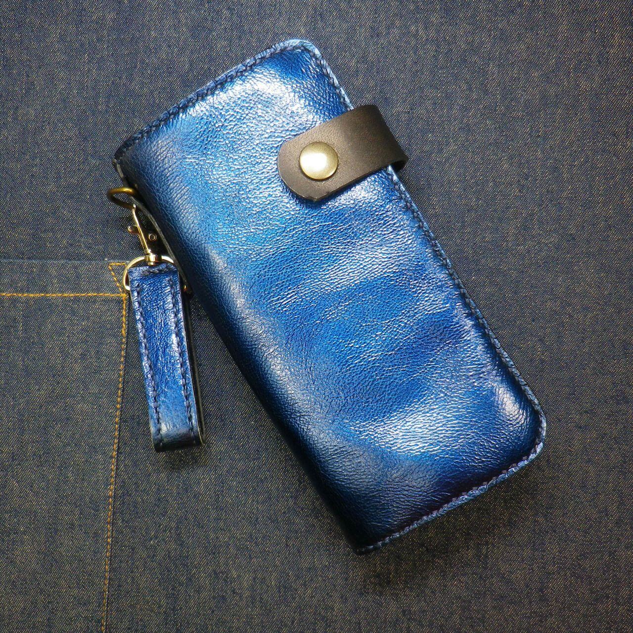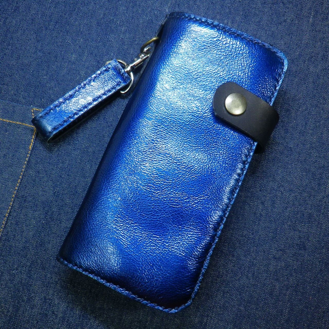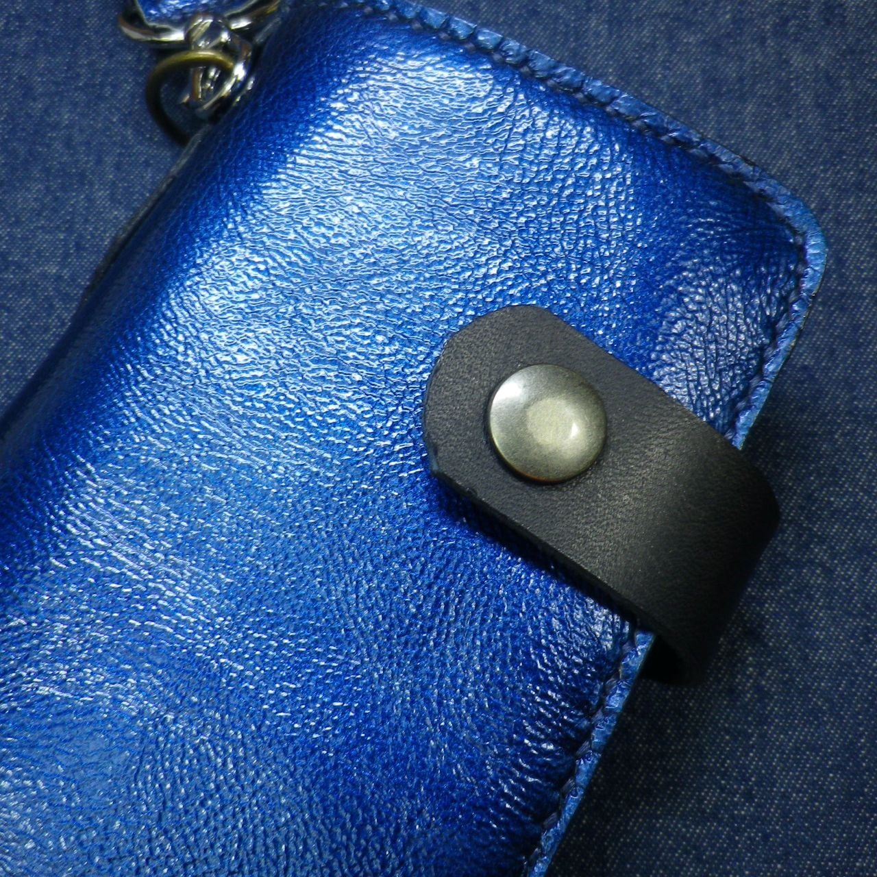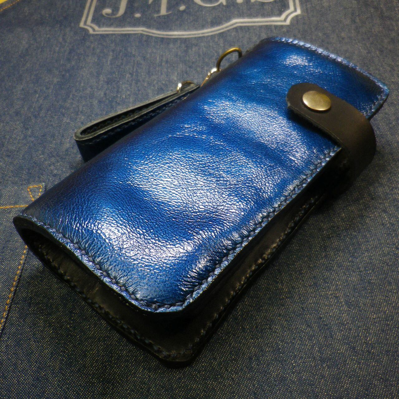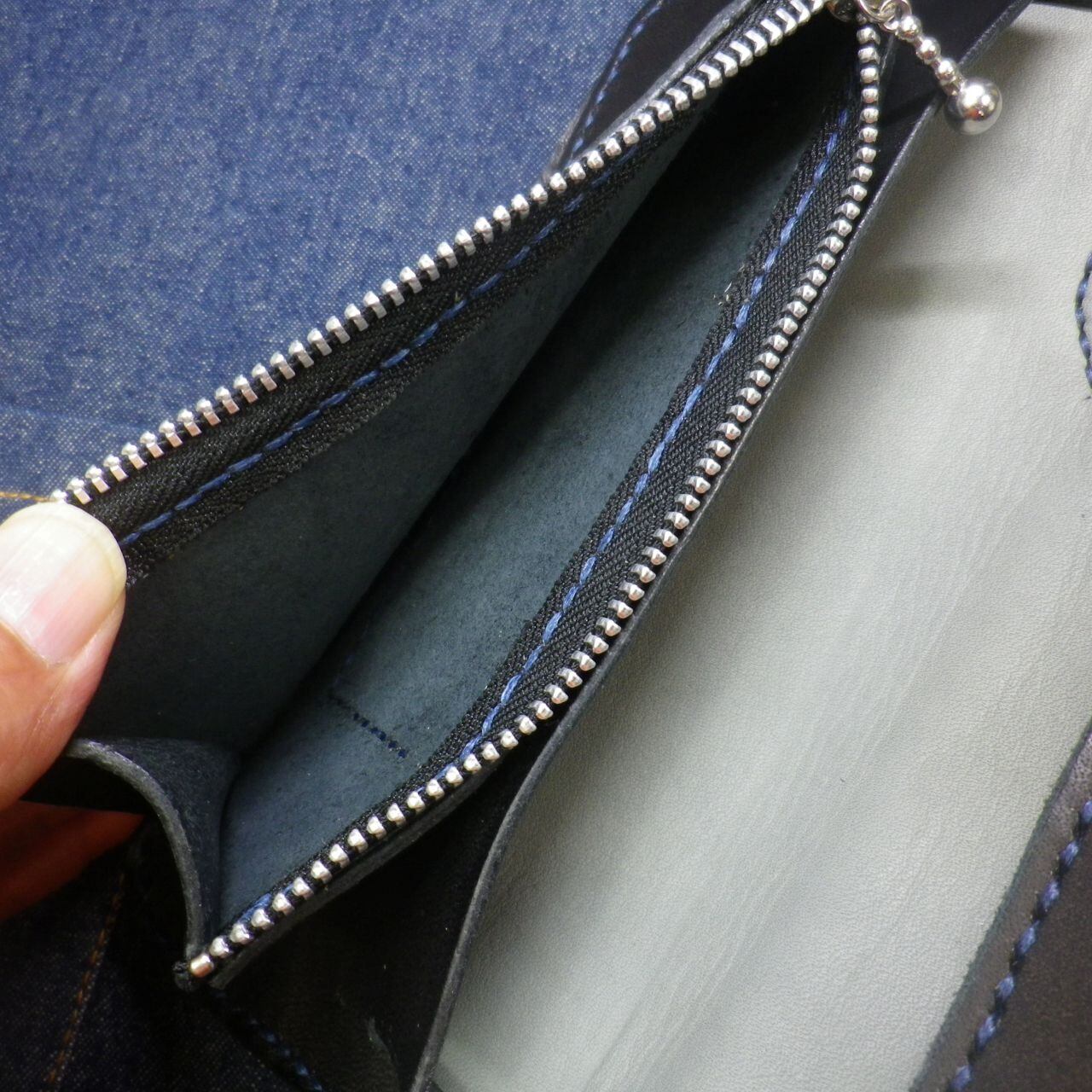 表面にエナメル本革を使い紙幣の入る部分にもシープスキン本革を縫い合わせてある逸品の長財布が出来上がりました。不用意に開いてしまうことを防止するボタンフックや、カードケースやジッパー付きのコインケースもすべて本革で作り込んであります。