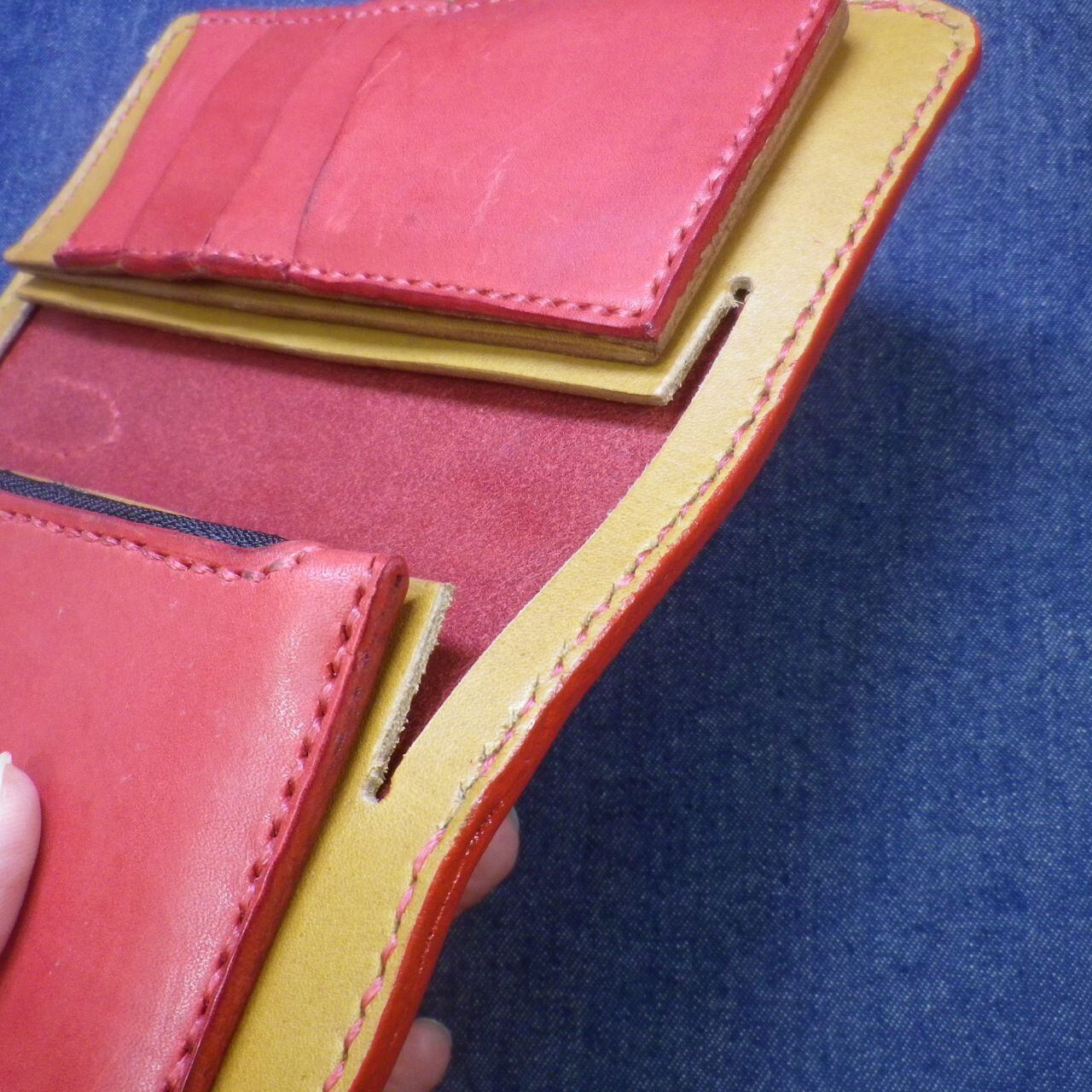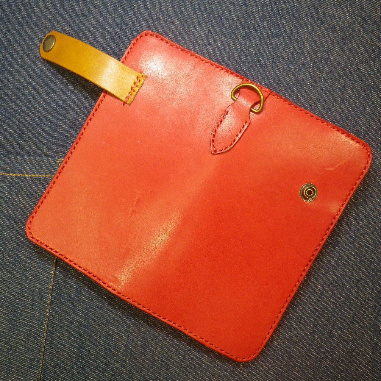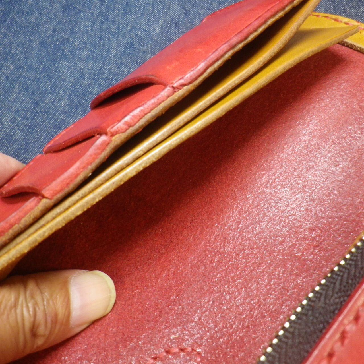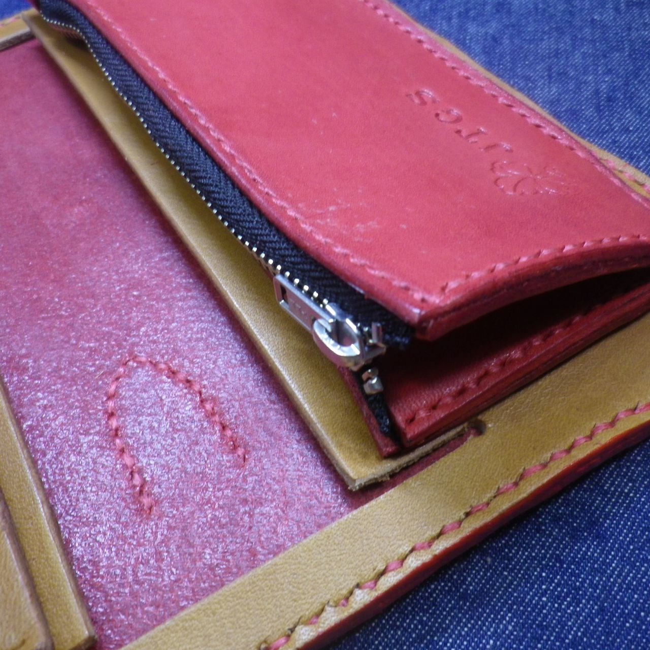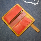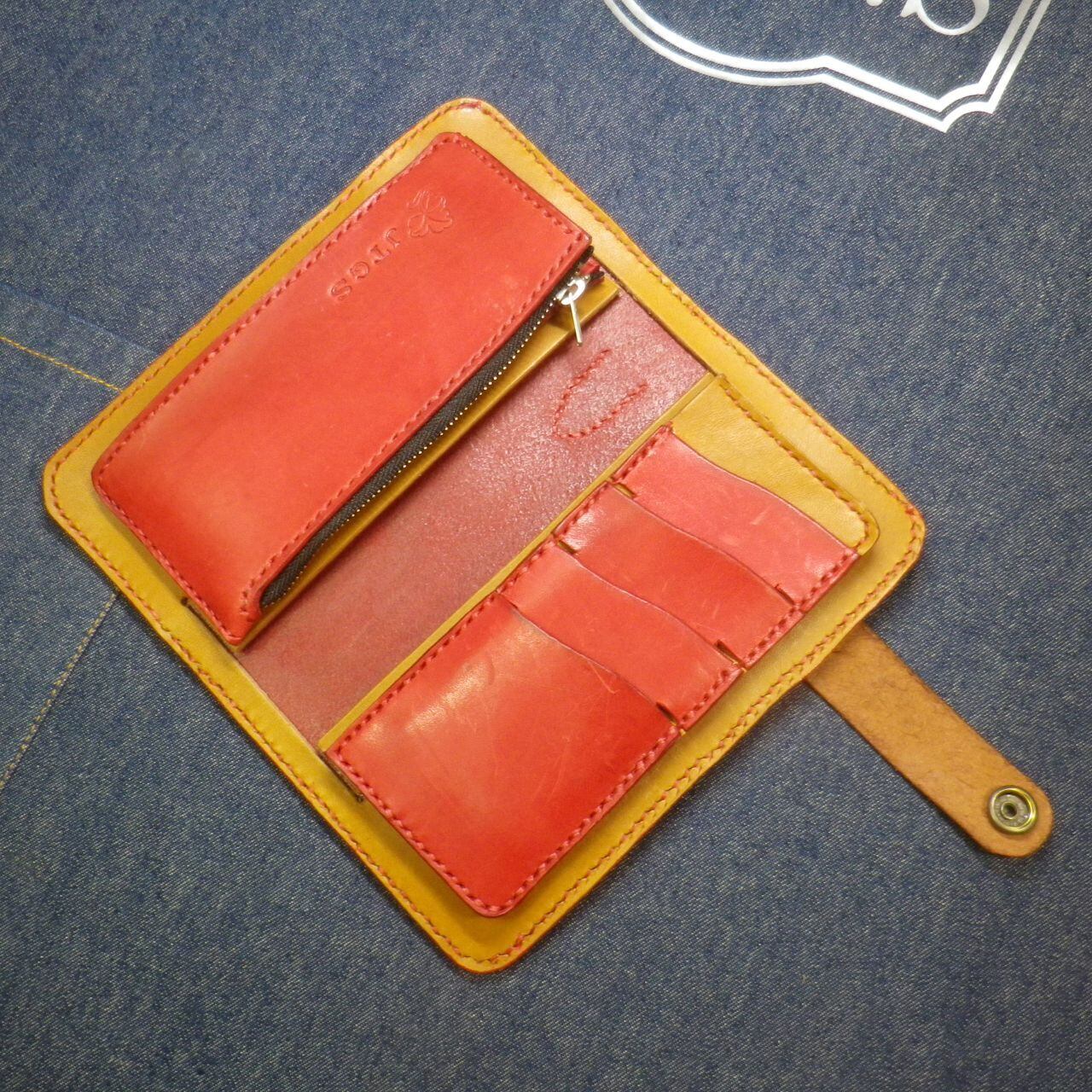表面にヌメ本革を使い裁断・縫製と全ての行程をハンドメイドで製作した逸品の長財布が出来上がりました。不用意に開いてしまうことを防止するボタンフックや、カードケースやジッパー付きのコインケースもすべてヌメ本革で作り込んであります。