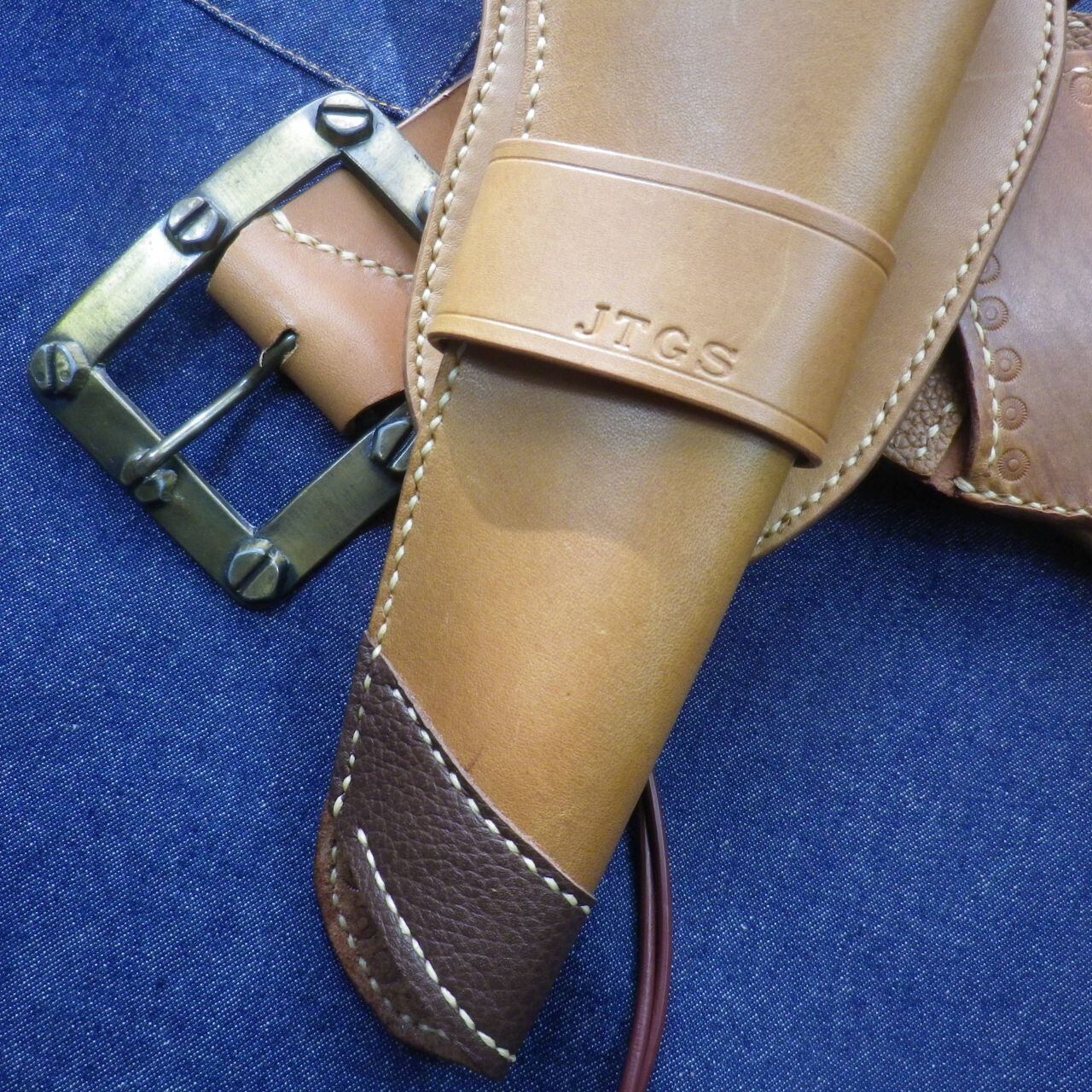 キャメル色の牛ヌメ本革のホルスターとベルトは使い込むほど良く馴染み風合いを増す、永くご愛用して頂ける大人のための逸品です。
