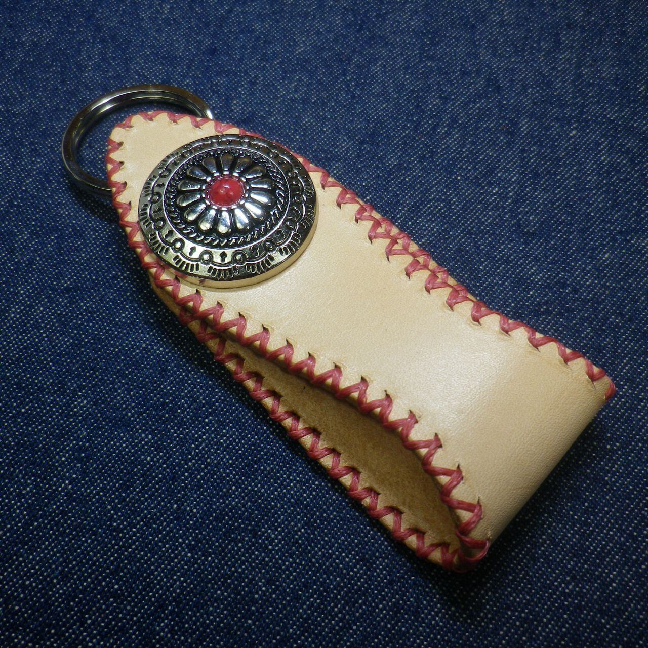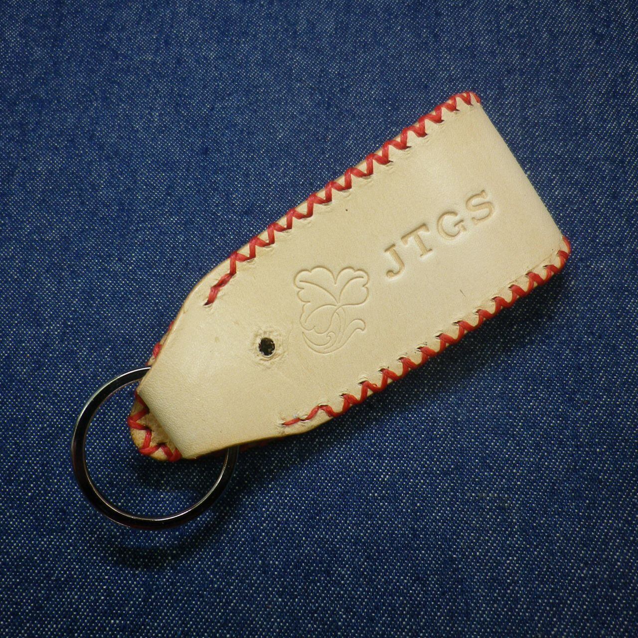 ●タンニン・ヌメ本革を使って製作いたしました、JTGSロゴ刻印を押したキーホルダーになります。ステッチをトライアングルに縫いこみました個性的なデザインで、各一点限りの限定品です。